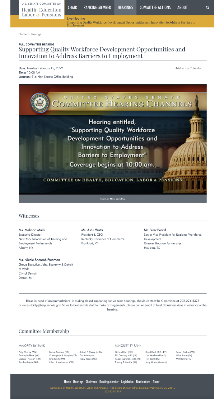 You can download the other testimonies and learn more about the committee members here: https://www.help.senate.gov/hearings/supporting-quality-workforce-development-opportunities-and-innovation-to-address-barriers-to-employment